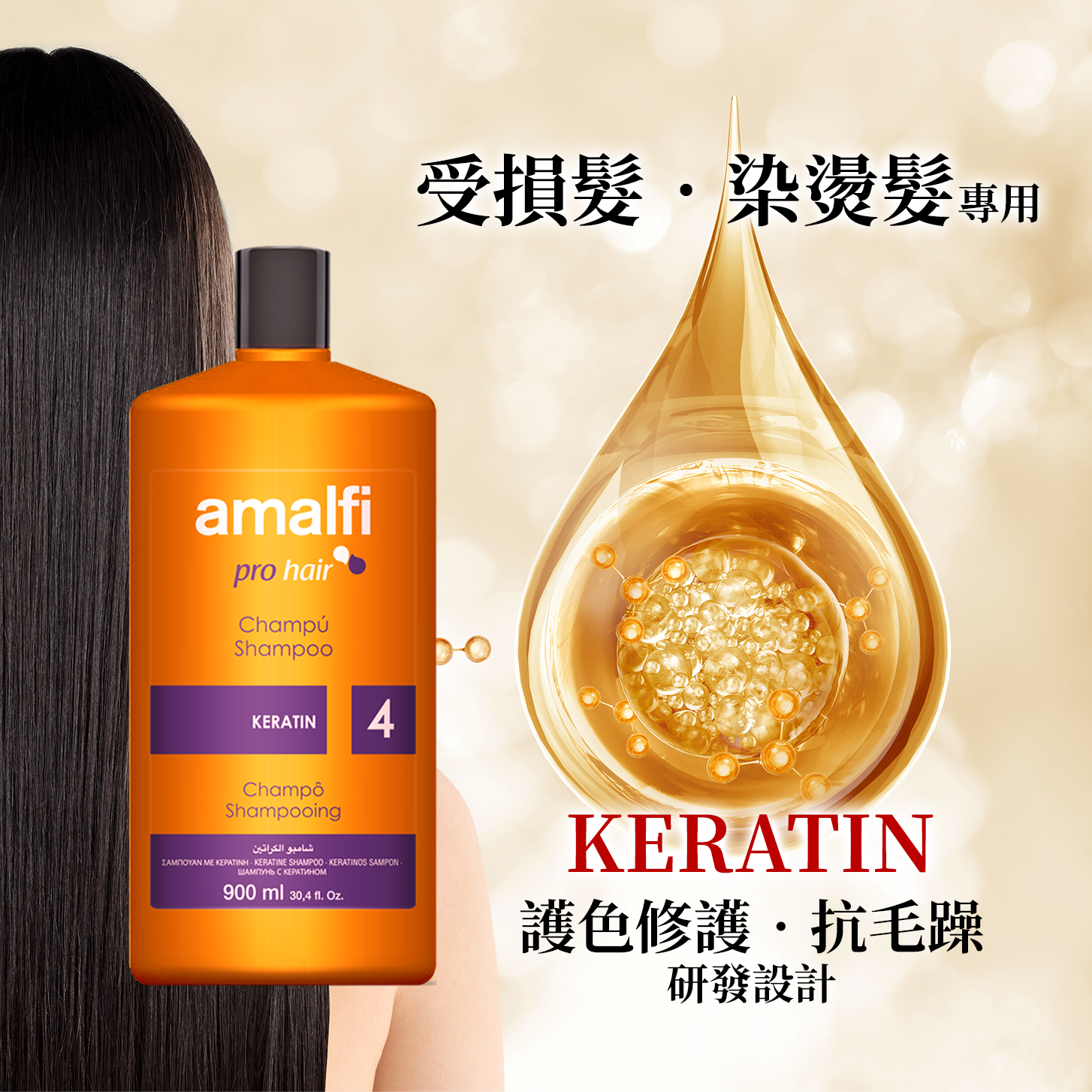 針對受損髮質/染燙髮後護色修護/抗毛躁研發設計;含有高濃度水解keratin+堅果油,瞬間滲透+修護受損髮質,效果更迅速顯見。因為濃度更高,更足以讓因剛染燙完後受化學藥劑傷害之脆弱髮,快速恢復健全!